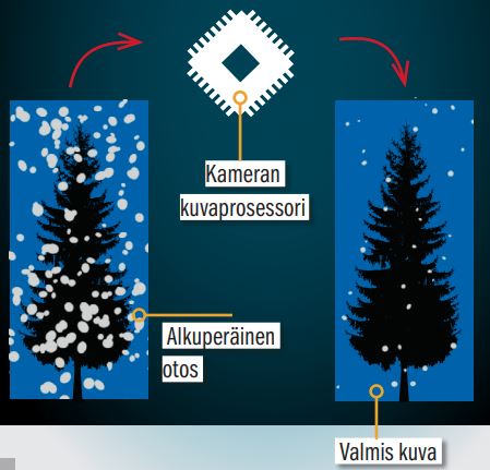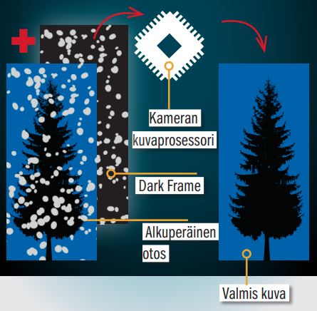 Kamera ottaa valotuksen jälkeen vielä toisen valotuksen, mutta avaamatta suljinta. Kuva numero kaksi on siis täysin musta. Sitä kuvaprosessori käyttää kuvakennolla muodostuvan kohinan tunnistamiseen. Prosessori poistaa näin tunnistamansa kohinan alkuperäisestä kuvasta. Sitten otokselle tehdään vielä normaali kohinanpoisto, ja tuloksena on merkittävästi puhtaampi kuva.