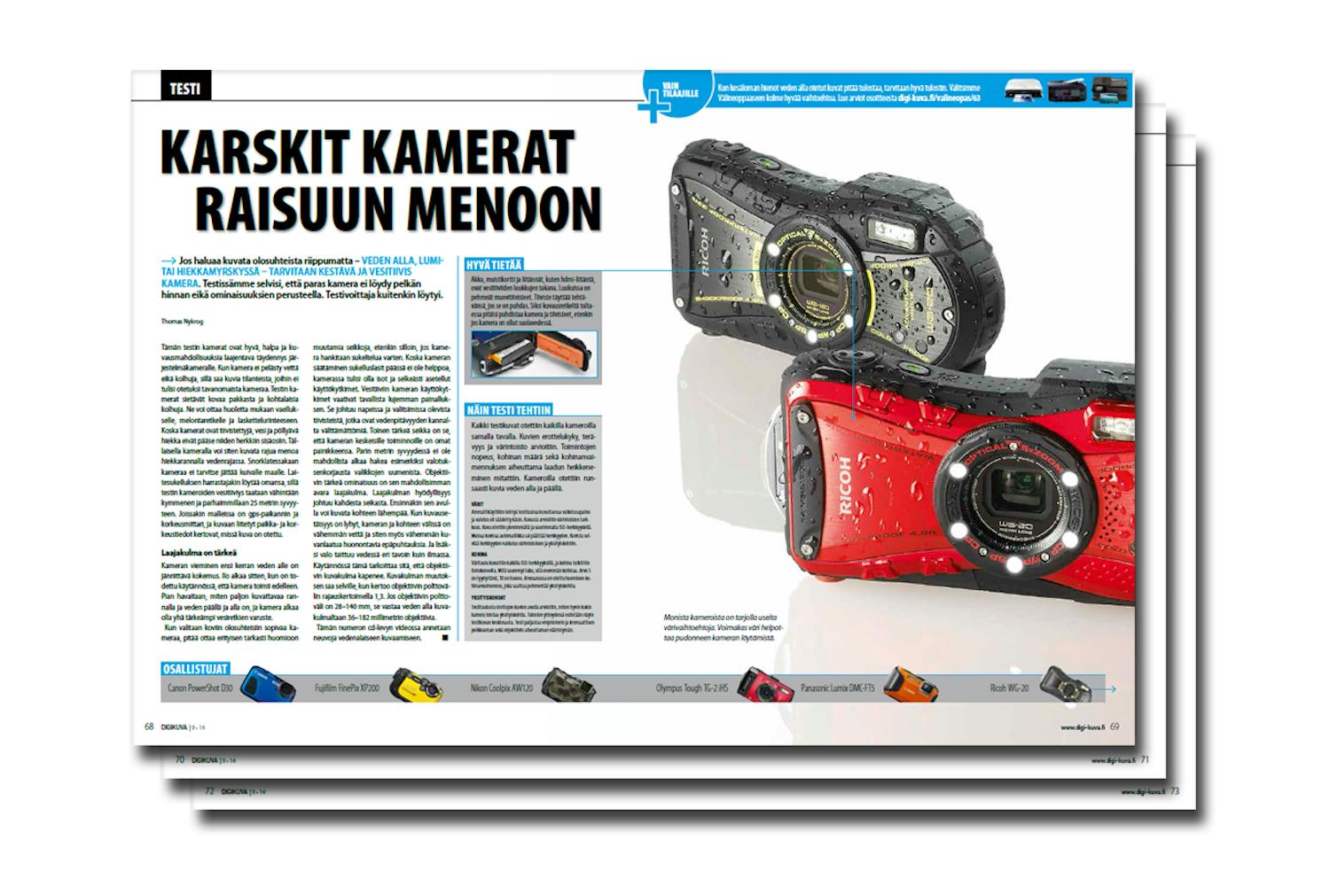 Tämän testin kamerat ovat hyvä, halpa ja kuvausmahdollisuuksia laajentava täydennys järjestelmäkameralle. Kun kamera ei pelästy vettä eikä kolhuja, sillä saa kuvia tilanteista, joihin ei tulisi otetuksi tavanomaista kameraa. Testin kamerat sietävät kovaa pakkasta ja kohtalaisia kolhuja. Ne voi ottaa huoletta mukaan vaellukselle, melontaretkelle ja laskettelurinteeseen. Koska kamerat ovat tiivistettyjä, vesi ja pöllyävä hiekka eivät pääse niiden herkkiin sisäosiin. Tällaisella kameralla voi siten kuvata rajua menoa hiekkarannalla vedenrajassa. Snorklatessakaan kameraa ei tarvitse jättää kuivalle maalle. Laitesukelluksen harrastajakin löytää omansa, sillä testin kameroiden vesitiiviys taataan vähintään kymmenen ja parhaimmillaan 25 metrin syvyyteen. Joissakin malleissa on gps-paikannin ja korkeusmittari, ja kuvaan liitetyt paikka- ja korkeustiedot kertovat, missä kuva on otettu.