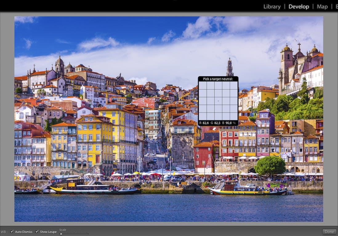 Nopein tapa korjata valokuvan valkotasapaino on painaa W-näppäintä ja napsauttaa neutraalin valkoista tai harmaata (tai sellaiseksi tarkoitettavaa) aluetta kuvassa.