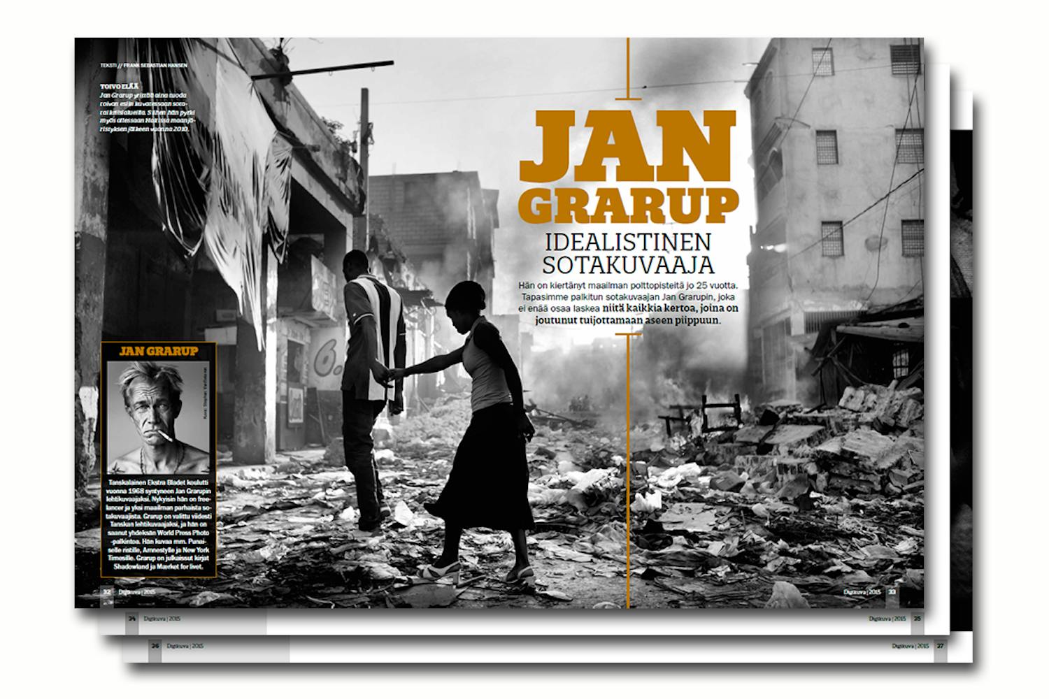 Haastattelun saaminen sotakuvaaja Jan Grarupilta vaati lukemattomia sähköposteja. Lukemattomia. Istuimme lopulta tunnin odottamassa kahvilassa, jonne tapaaminen oli sovittu, eikä Grarupia vieläkään näkynyt. Soitimme perään, ja hän pahoitteli. Oli sattunut este. Mies, joka on viettänyt vuosikausia suuren osan ajastaan maailman alati muuttuvissa polttopisteissä, ei aikatauluta elämäänsä turhan tarkasti. Meidät kutsuttiin lopulta kuvaajan boheemiin Kööpenhaminan-asuntoon, joka oli täynnä uusia ja vanhoja kameroita, valokuvakirjojen pinoja ja kehystettyjä kuvia. Jan Grarup muistutti suupielessä roikkuvine sätkineen, tatuoituine kehoineen ja havaijihameineen enemmän rocktähteä kuin idealistista sotakuvaajaa, joka on nähnyt 25 vuoden kuluessa maailman pahimmat sodat, kansanmurhat ja kriisit.