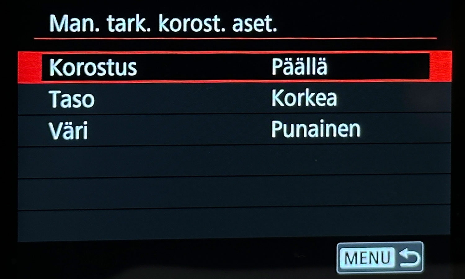 Näissä suhteellisen isoissa makrokohteissa automaattitarkennus toimii hyvin. Valitse pieni tarkennuspiste ja aseta se täsmälleen siihen kohtaan, jossa kohteen on oltava terävä. On tärkeää olla tarkka, koska alueet terävän alueen edessä ja takana tulevat olemaan sumeita, kun kuvataan lyhyeltä etäisyydeltä. Tämä on tärkeää huomioida etenkin, kun kuvataan esimerkiksi lehti vinoittain. Suoraan edestä kuvattuna sen koko pinta on suunnilleen samalla etäisyydellä kamerasta, jolloin koko lehdestä tulee terävä, ja on vähemmän tärkeää, mihin tarkalleen tarkennetaan.