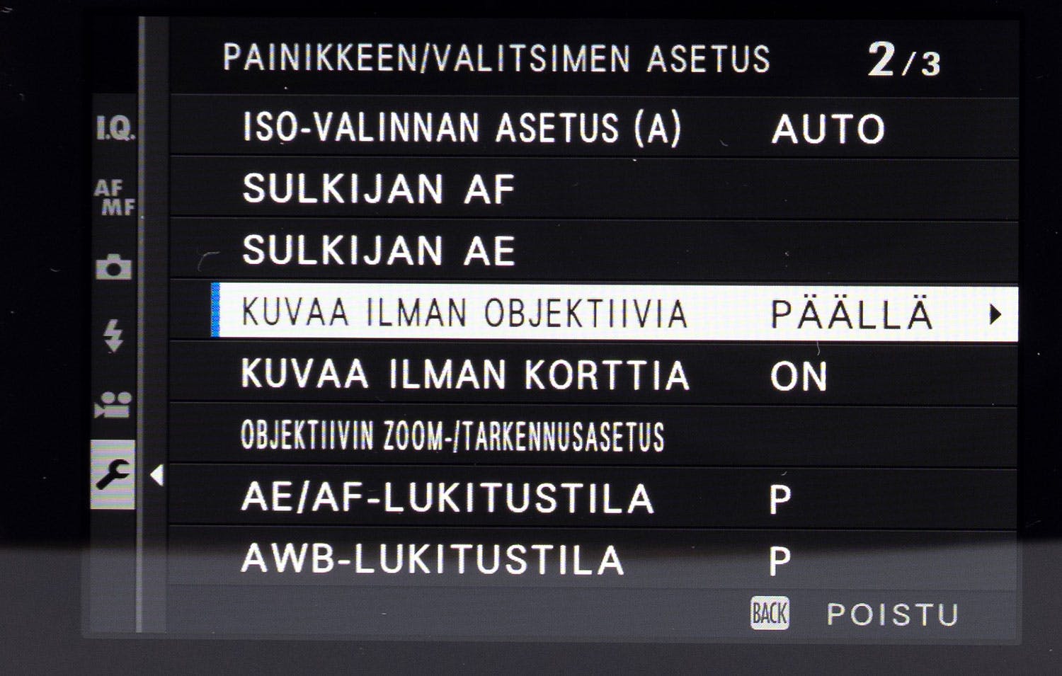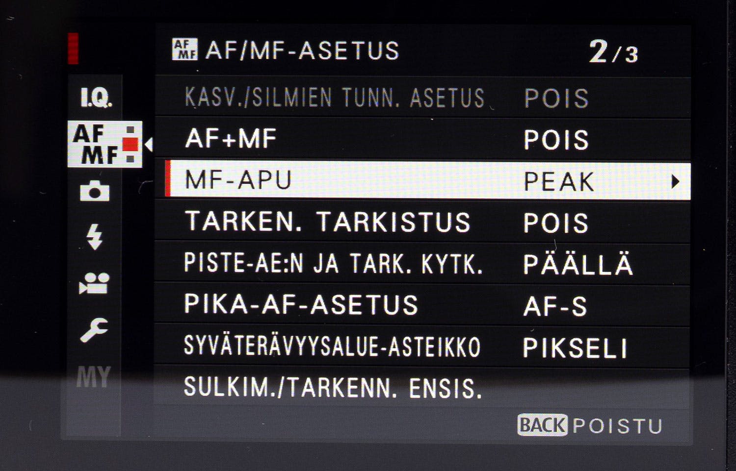 Kamerasta riippuen käsitarkennus on valittava painikkeella tai valikosta. Muutoin käsitarkennuksen aputoiminnot, kuten focus peaking, eivät toimi.