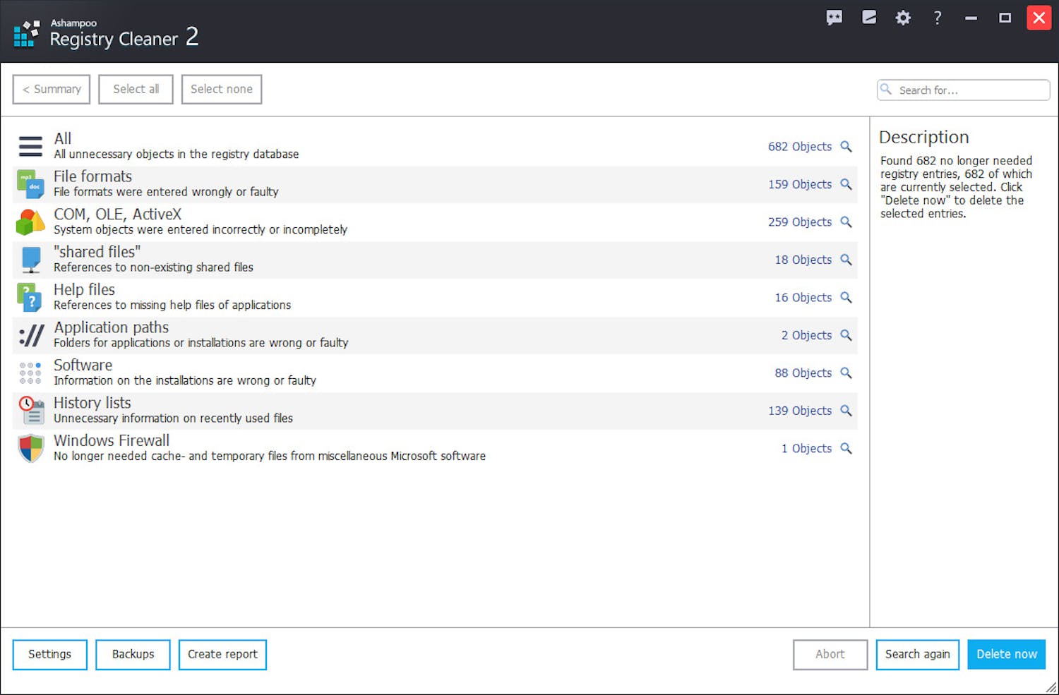 Ashampoo Registry Cleaner 2:n täysversiolla voit puhdistaa Windowsin rekisterin, mikä tekee tietokoneesta nopeamman ja vakaamman kuin ennen.