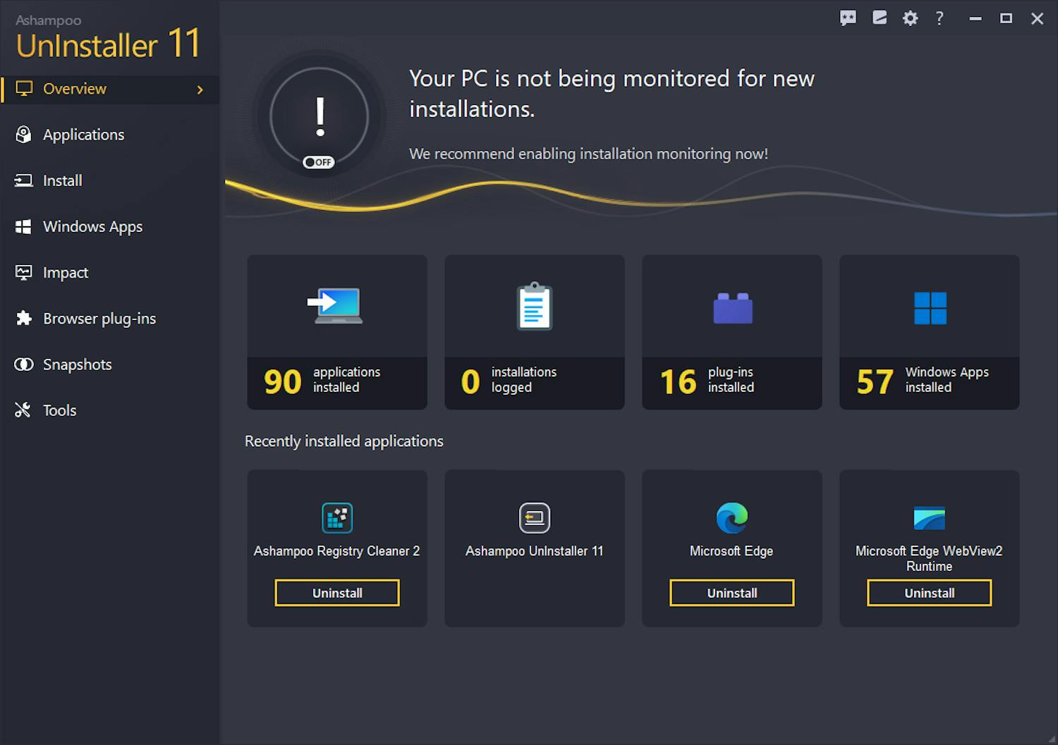 Kun sovellus avautuu, voit kytkeä uusien sovellusten seurannan päälle napsauttamalla yläreunasta huutomerkkiä, jotta ohjelma pystyy tarvittaessa myöhemmin poistamaan ne tehokkaasti. Napsauta Applications, niin näet tietokoneeseen asennetut sovellukset. Voit valita yhden tai useamman sovelluksen ja poistaa ne napsauttamalla Uninstall kahdesti.